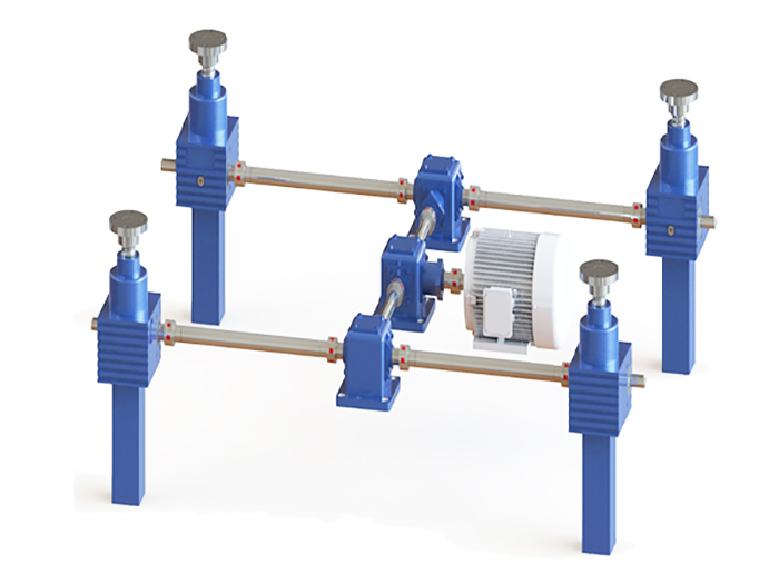 多臺聯動絲桿升降機平臺,電機在中間,電機連接轉向箱或者K系列減速機,在通過連接桿和···